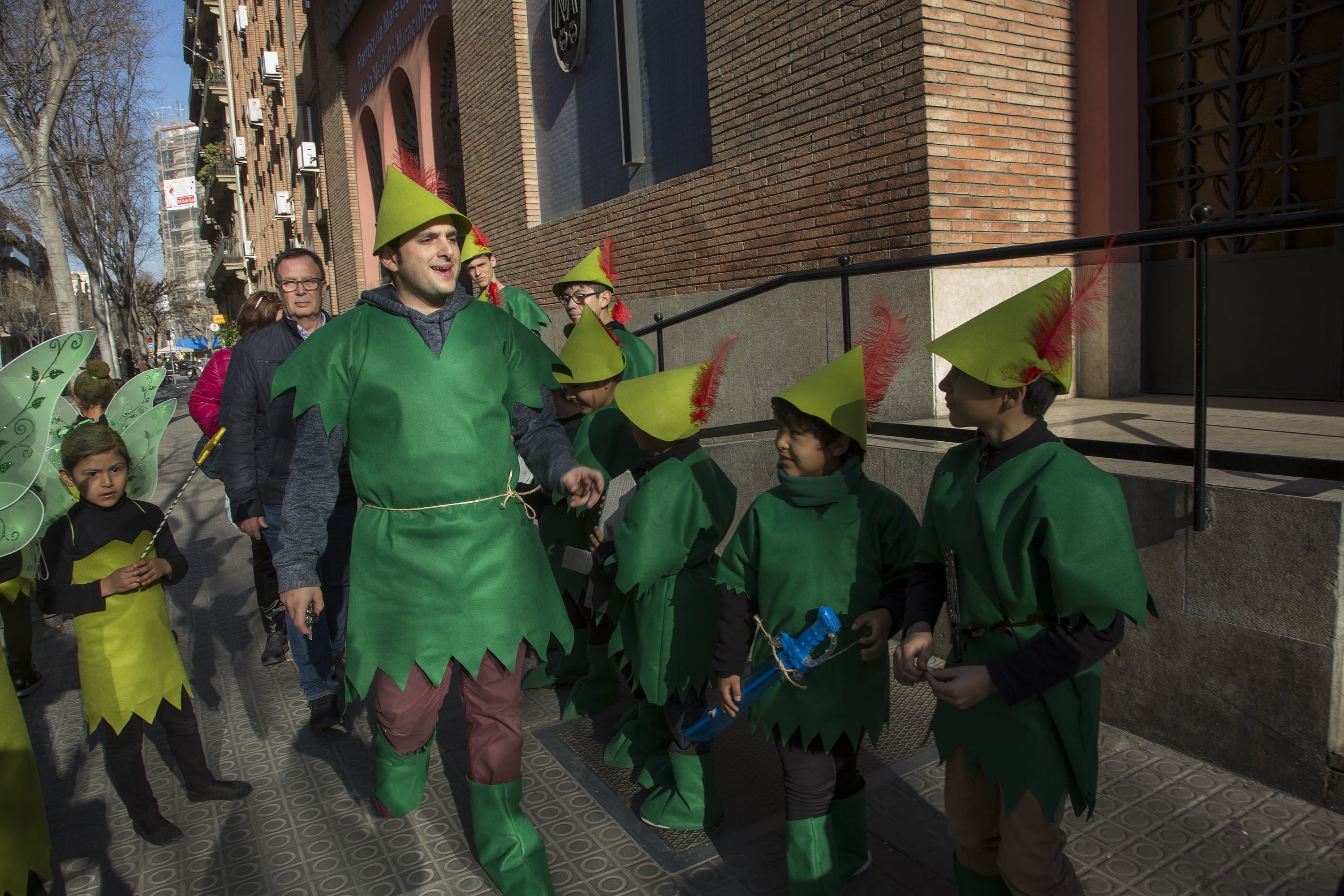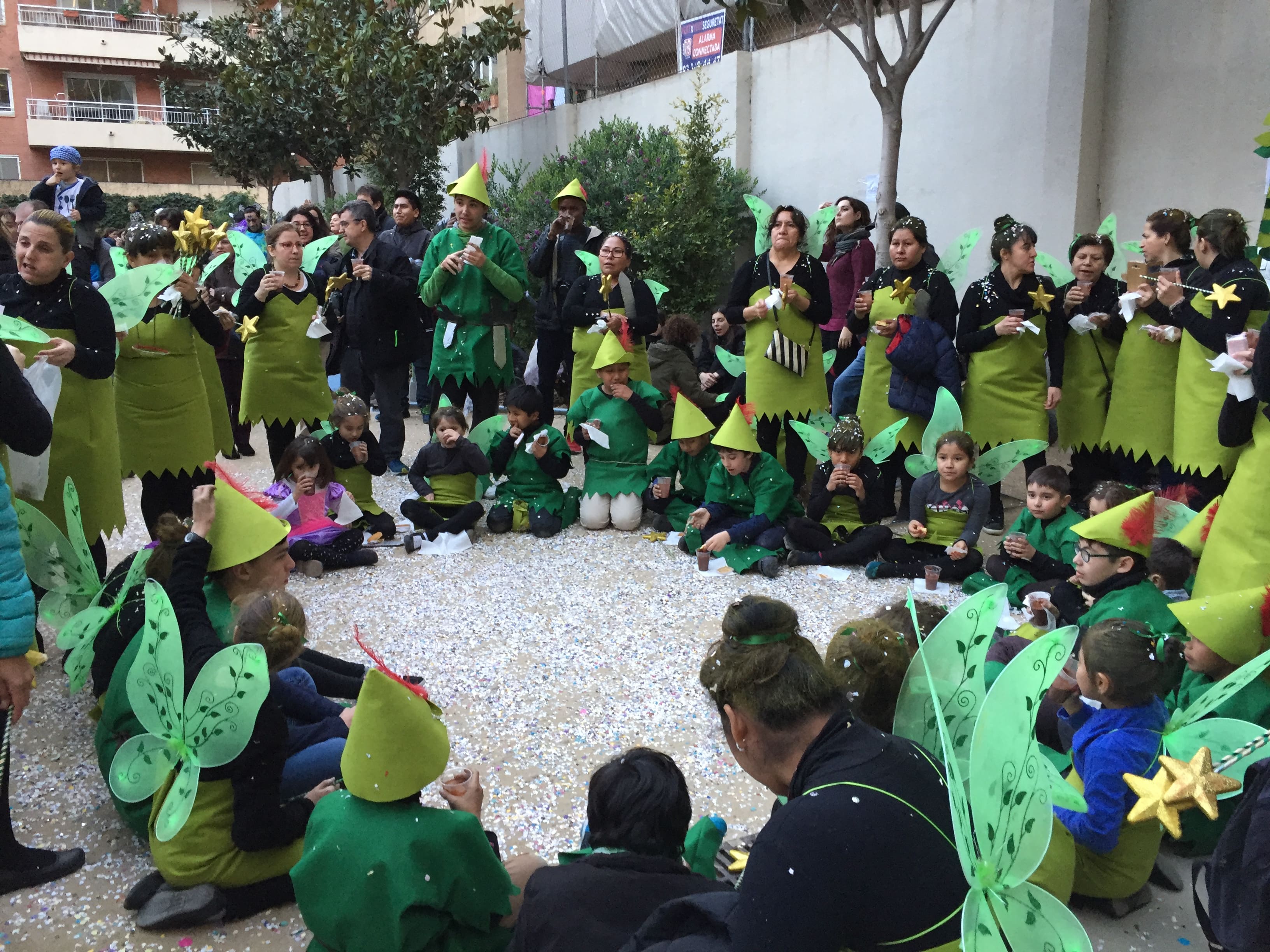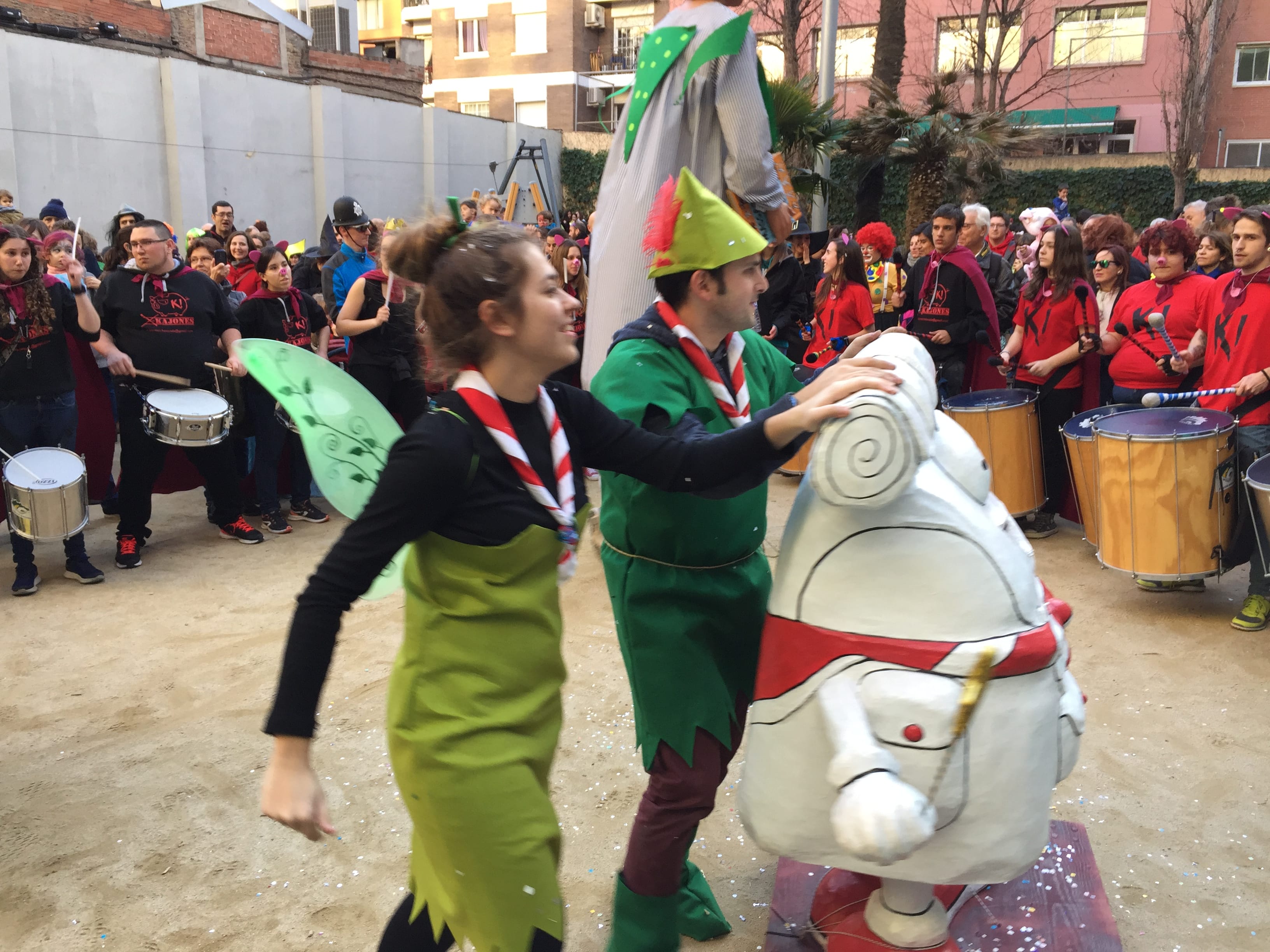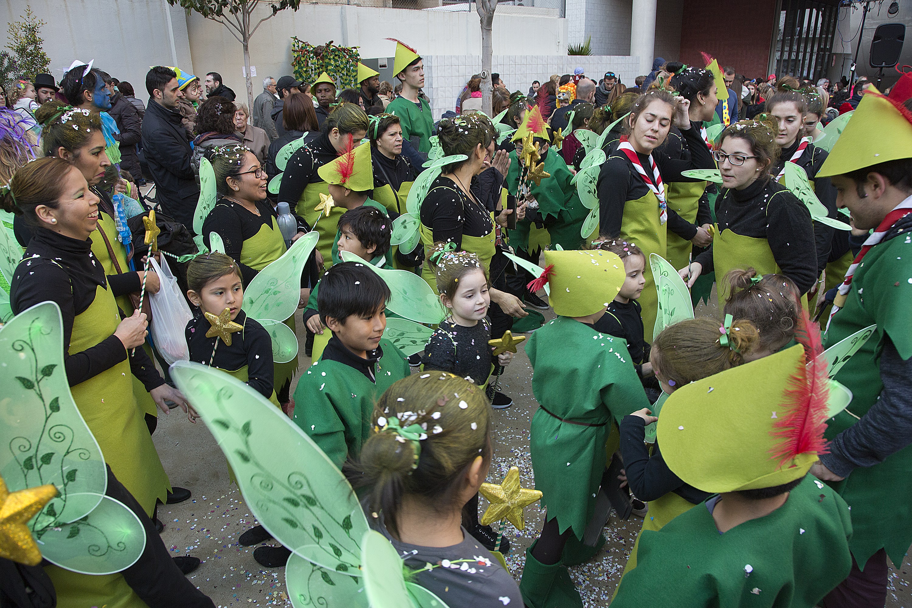 Dissabte, com a colofó d'una intensa setmana de preparatius, tocava sortir al carrer a desfilar per la rua del barri i lluir les nostres magnífiques disfresses. Les noies, transformades en Campanetes, anaven repartint pols màgica per tot arreu amb la seva vareta, mentre els nois, coberts amb el barret i la ploma de Peter Pan, brandaven incansablement les seves espases, preparant-se per la lluita contra el capità Garfi. En primera línia, el nostre estimat Mochilín obria la comparsa sota una pluja constant de confeti, i per darrere ens seguia un enorme arbre del país de "Nunca Jamas", on viuen en Peter Pan i la Campaneta.