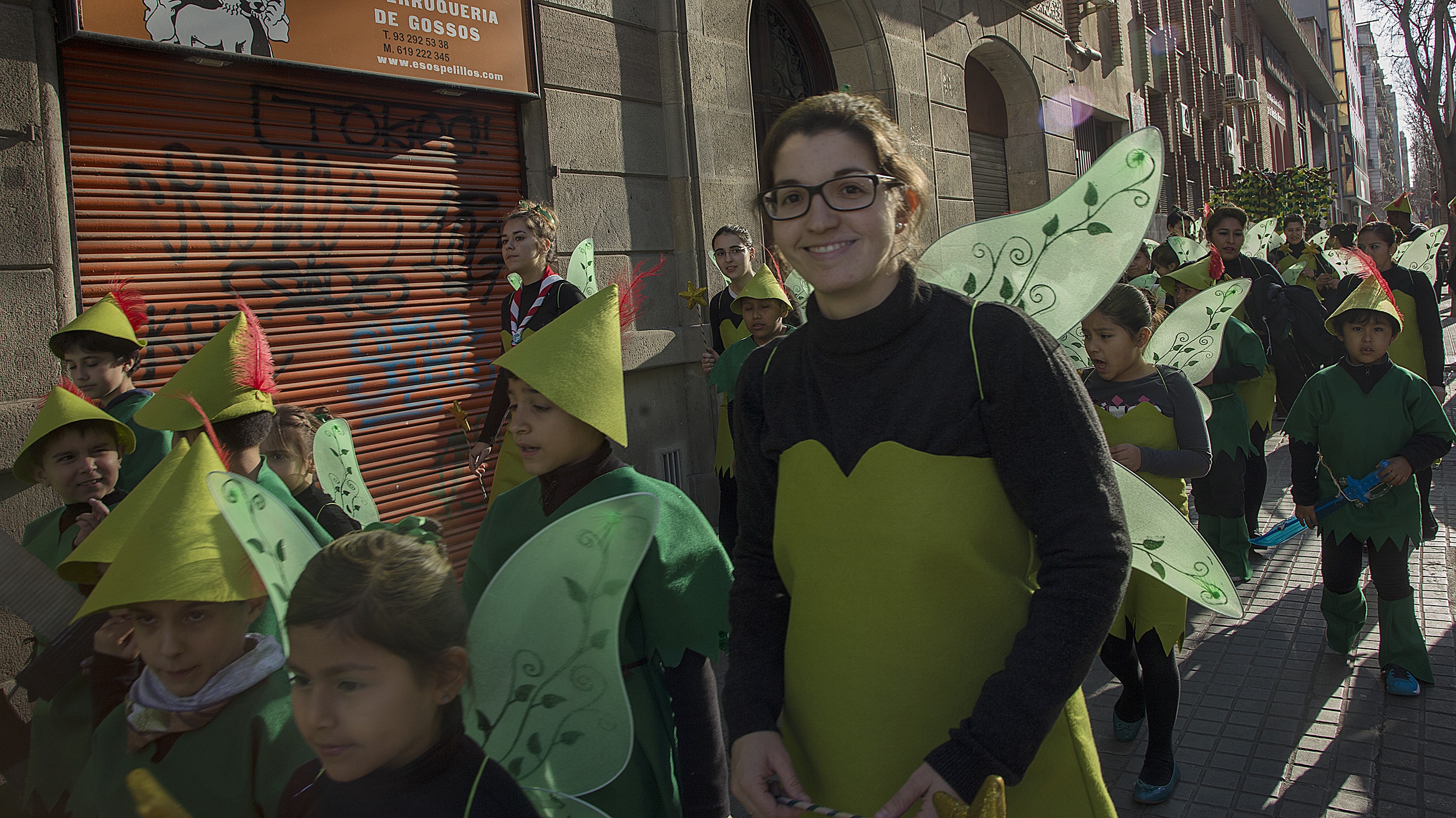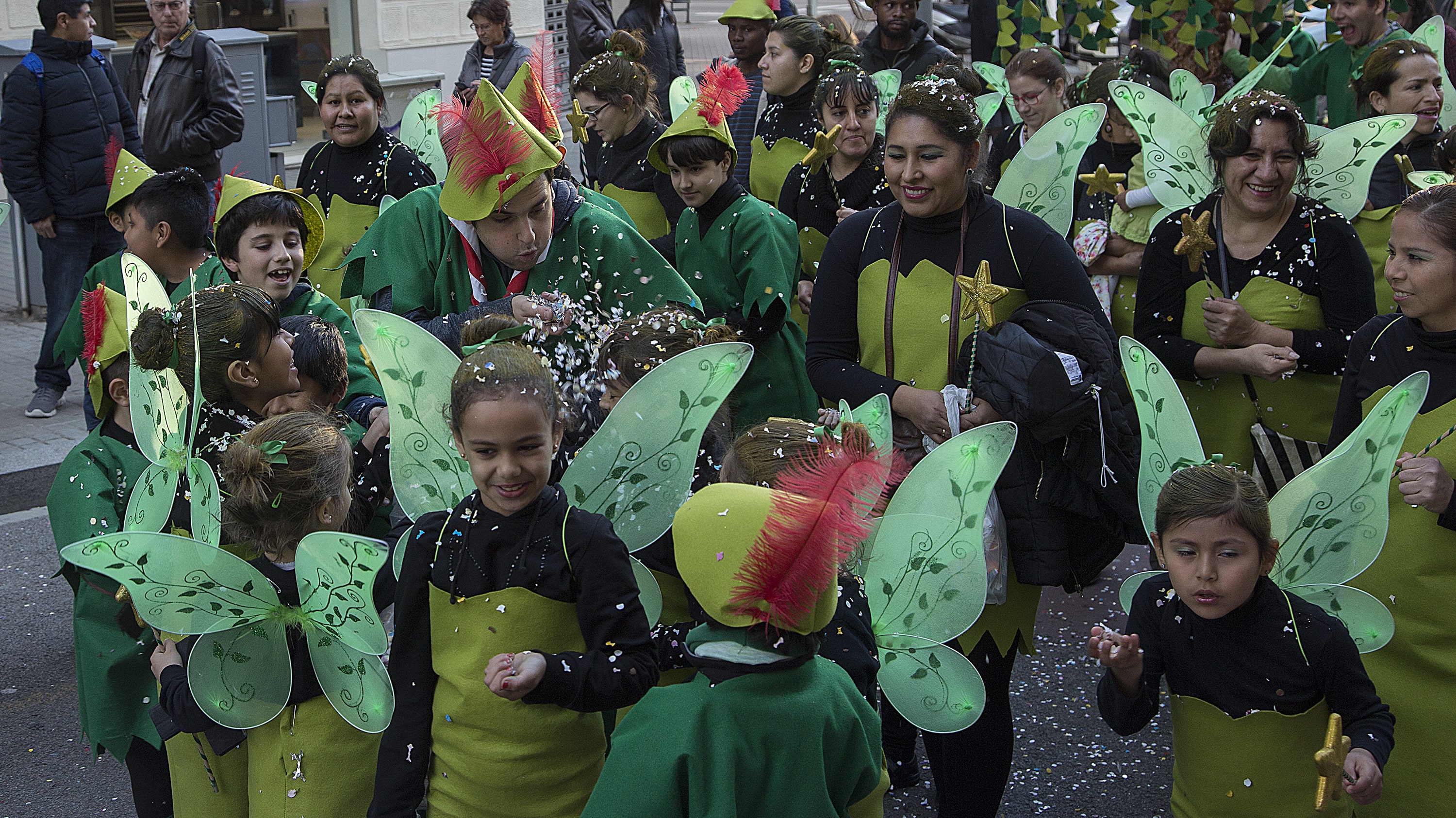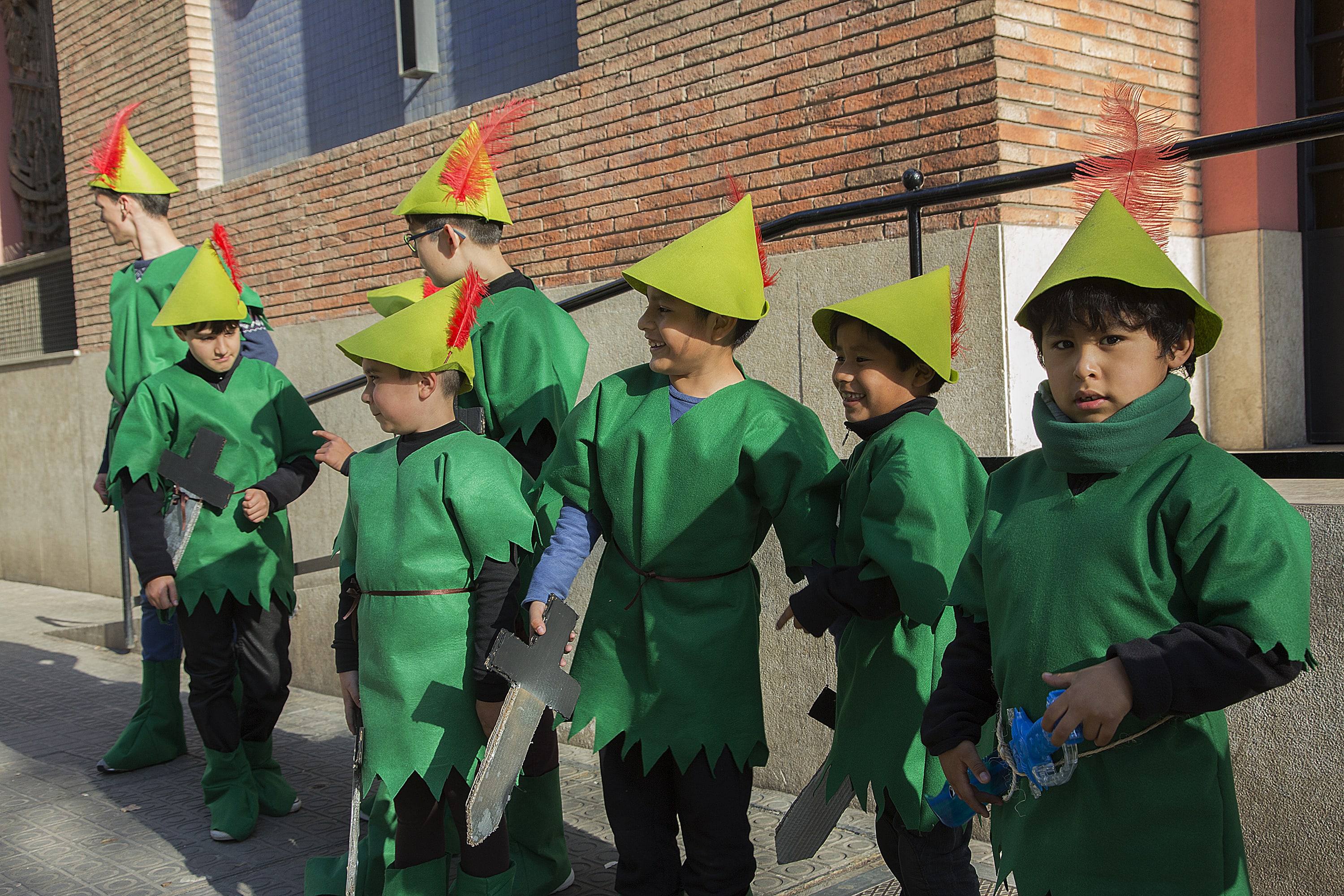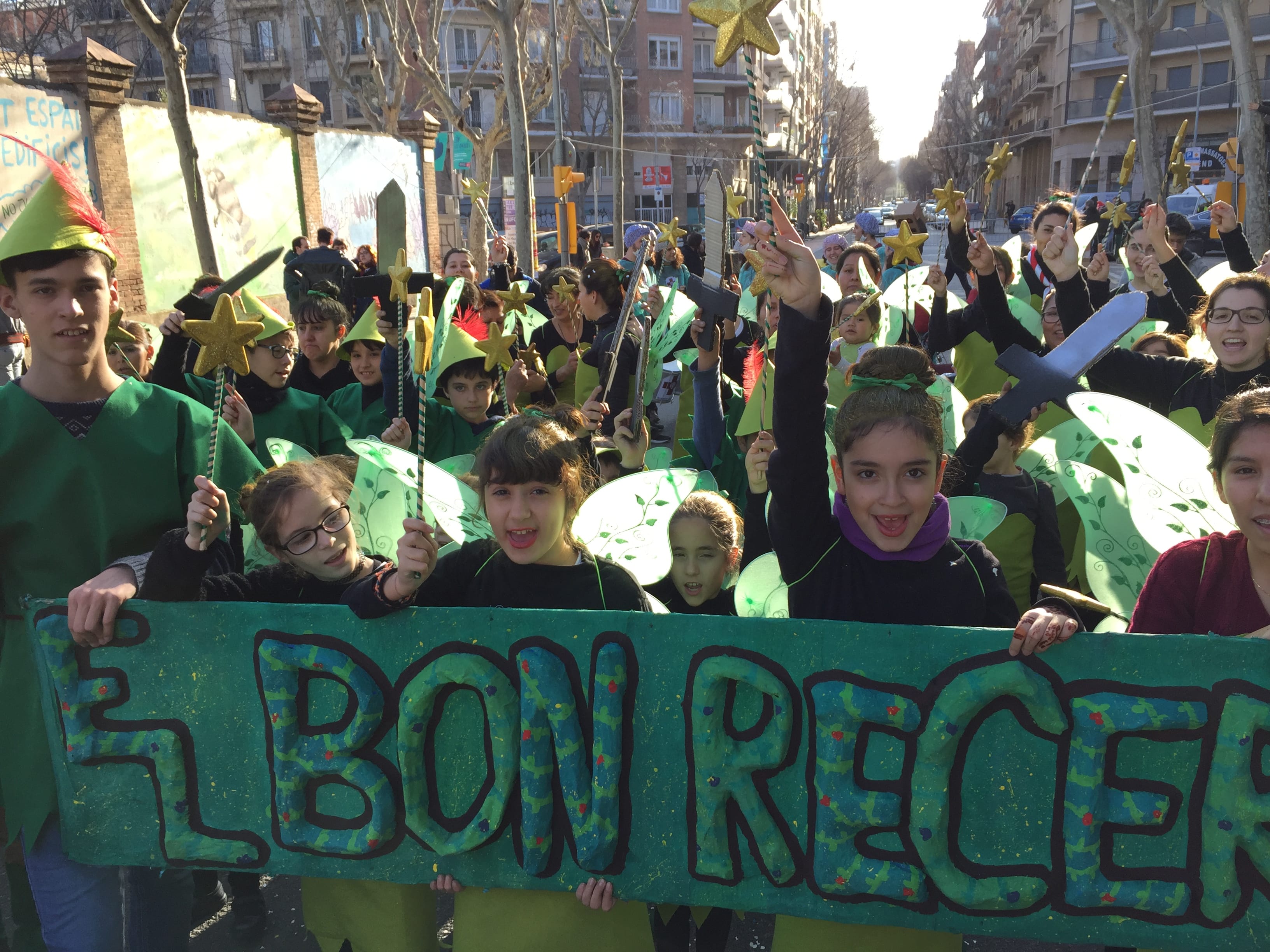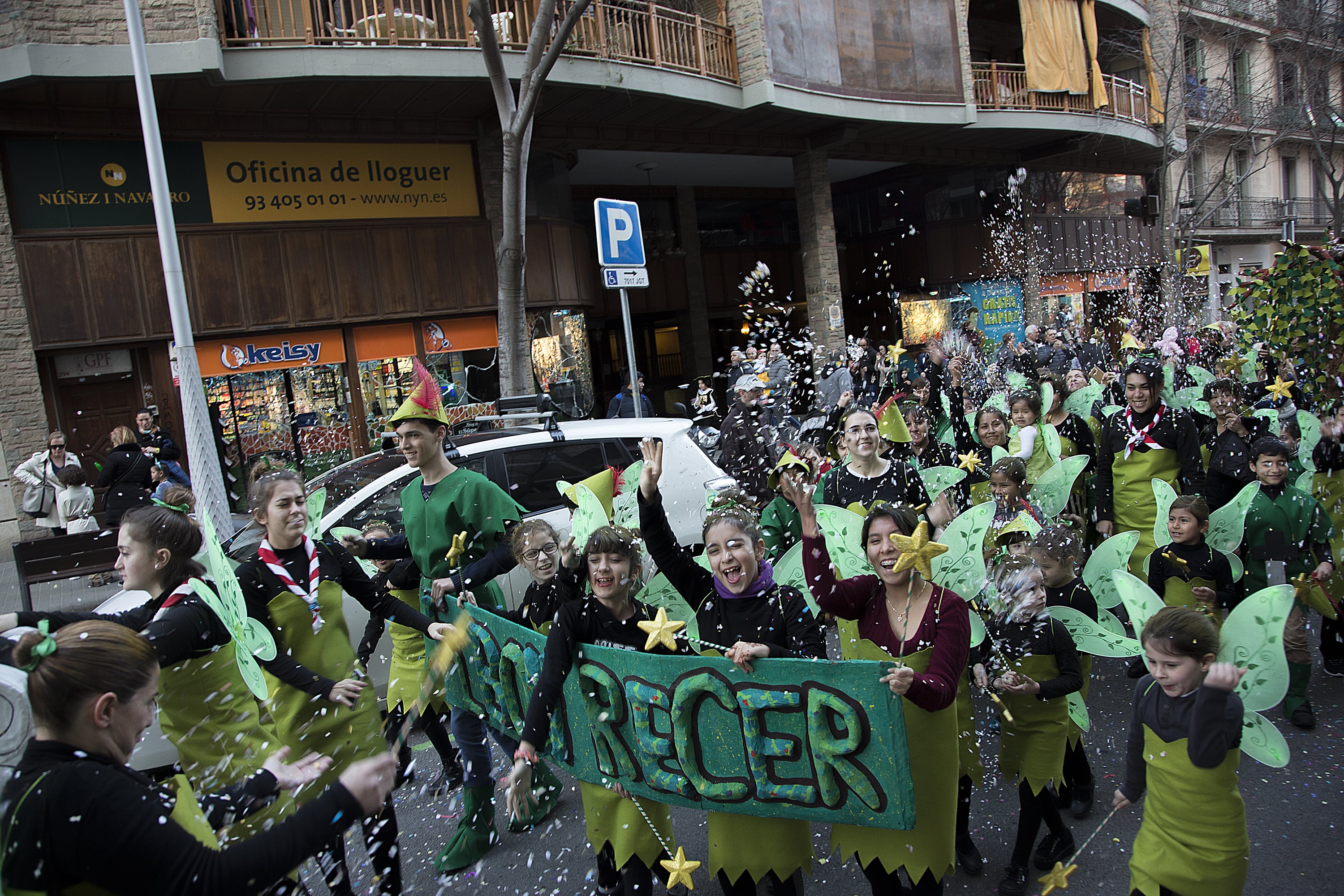 Dissabte, com a colofó d'una intensa setmana de preparatius, tocava sortir al carrer a desfilar per la rua del barri i lluir les nostres magnífiques disfresses. Les noies, transformades en Campanetes, anaven repartint pols màgica per tot arreu amb la seva vareta, mentre els nois, coberts amb el barret i la ploma de Peter Pan, brandaven incansablement les seves espases, preparant-se per la lluita contra el capità Garfi. En primera línia, el nostre estimat Mochilín obria la comparsa sota una pluja constant de confeti, i per darrere ens seguia un enorme arbre del país de "Nunca Jamas", on viuen en Peter Pan i la Campaneta.