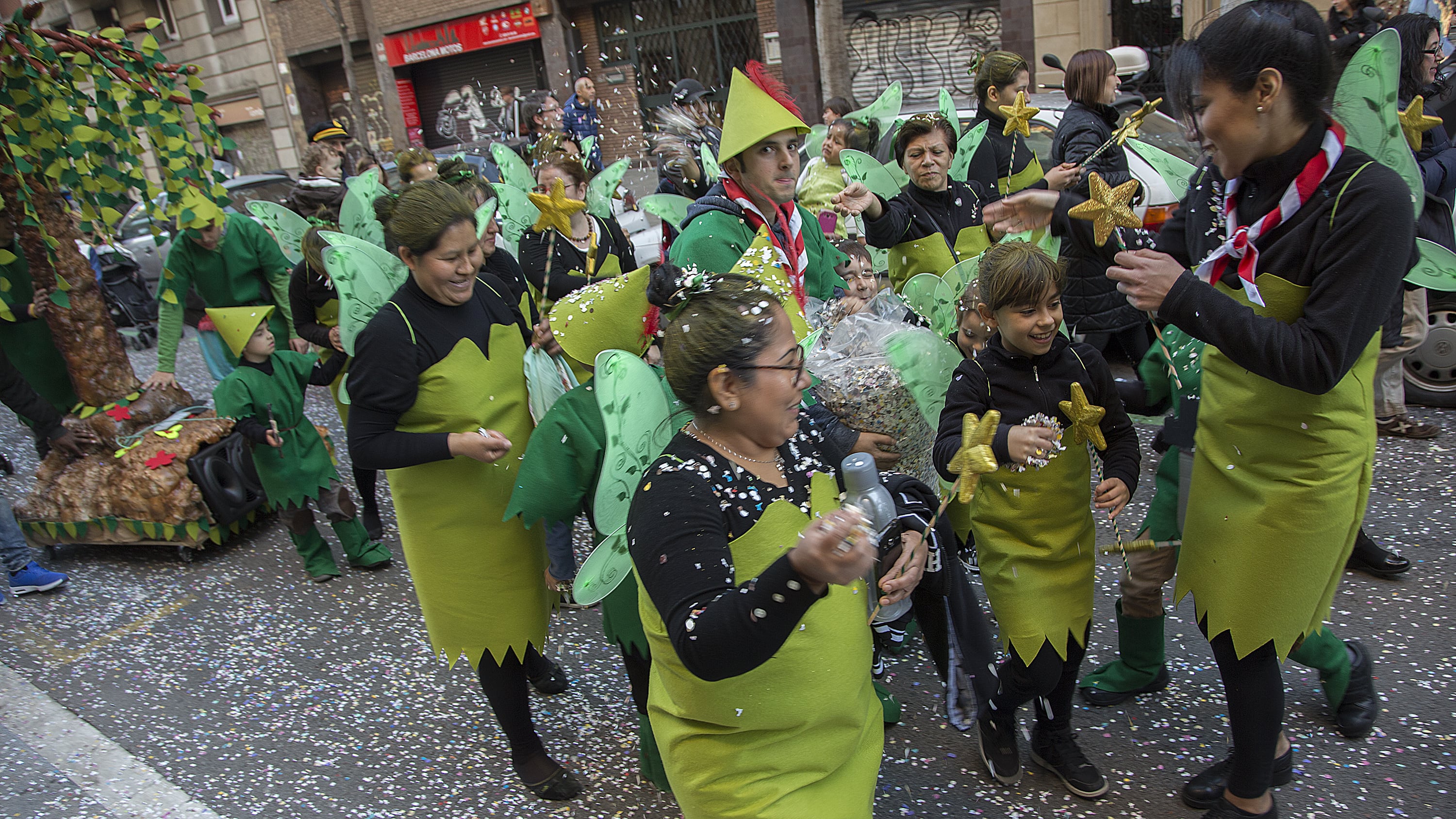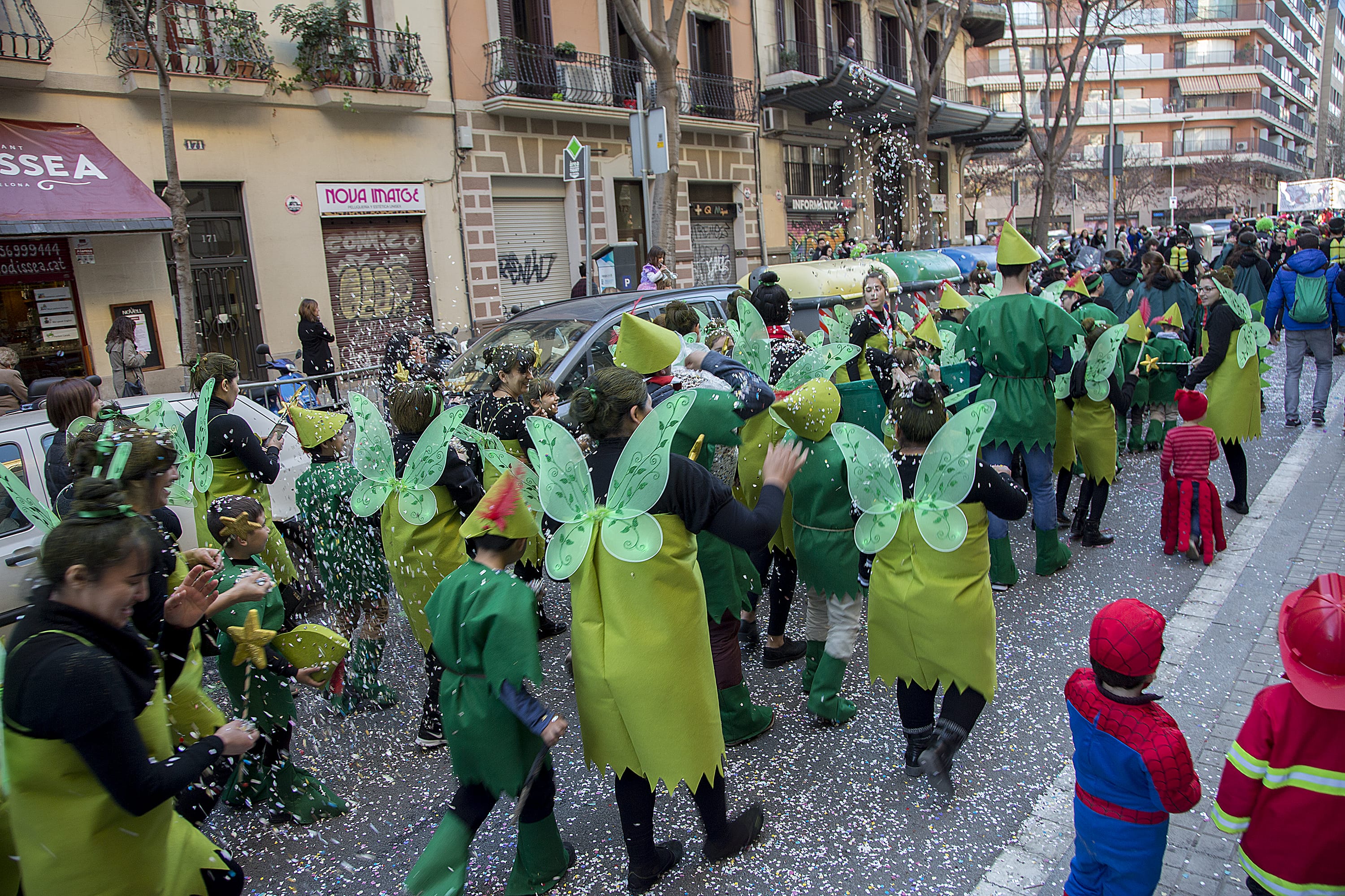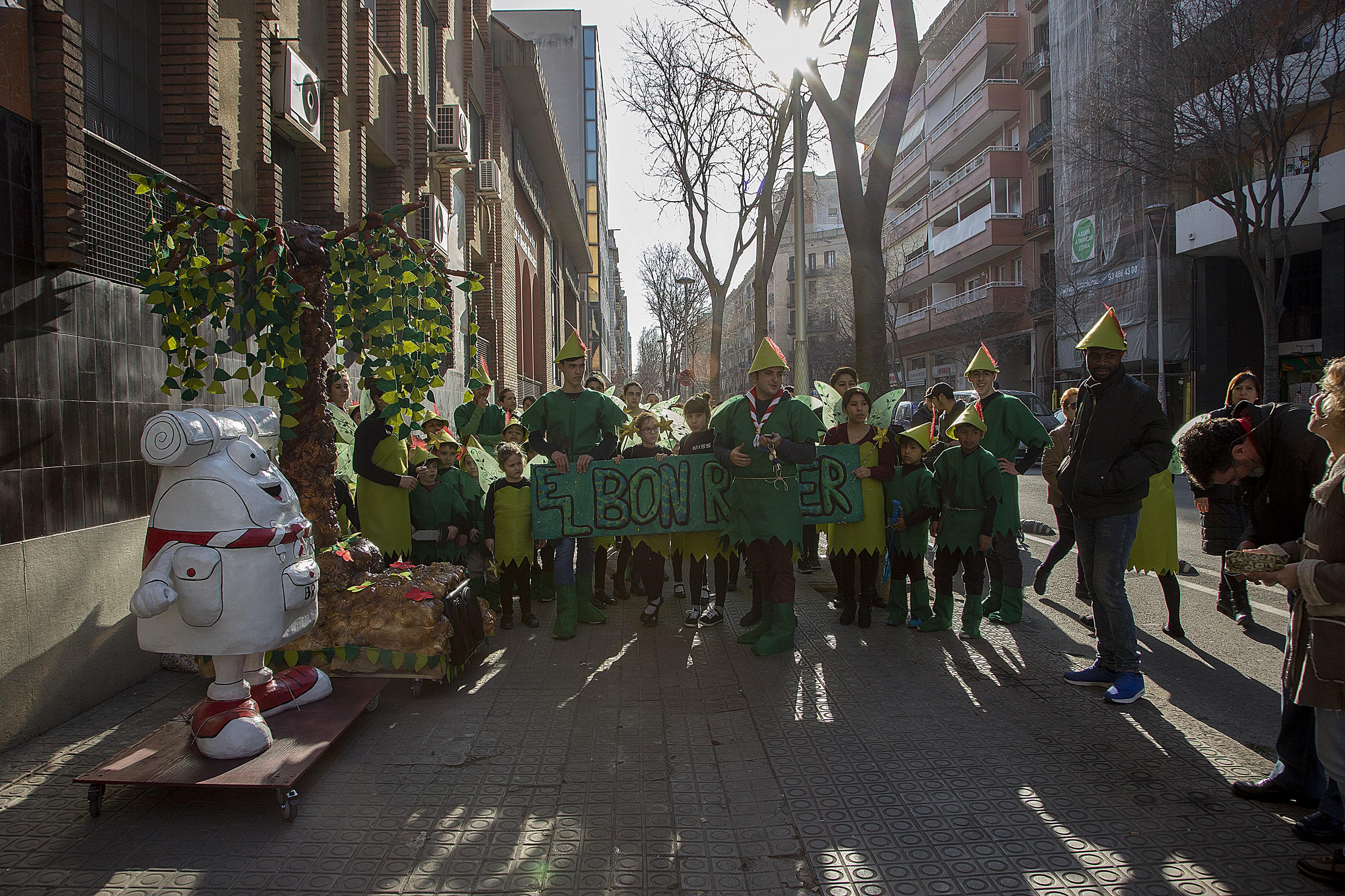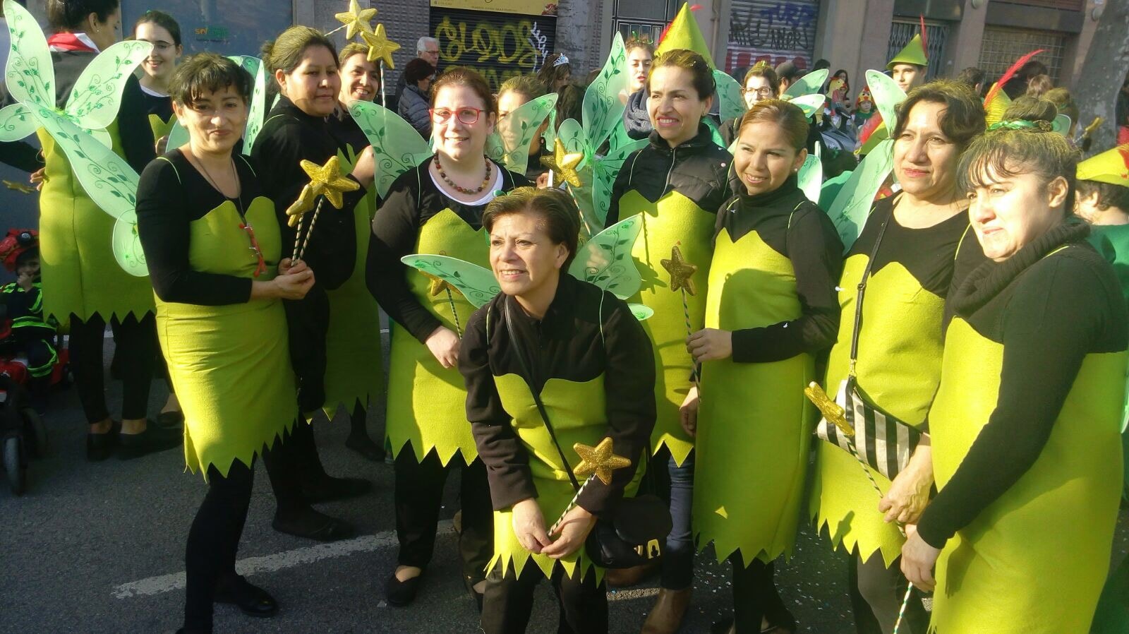 Dissabte, com a colofó d'una intensa setmana de preparatius, tocava sortir al carrer a desfilar per la rua del barri i lluir les nostres magnífiques disfresses. Les noies, transformades en Campanetes, anaven repartint pols màgica per tot arreu amb la seva vareta, mentre els nois, coberts amb el barret i la ploma de Peter Pan, brandaven incansablement les seves espases, preparant-se per la lluita contra el capità Garfi. En primera línia, el nostre estimat Mochilín obria la comparsa sota una pluja constant de confeti, i per darrere ens seguia un enorme arbre del país de "Nunca Jamas", on viuen en Peter Pan i la Campaneta.