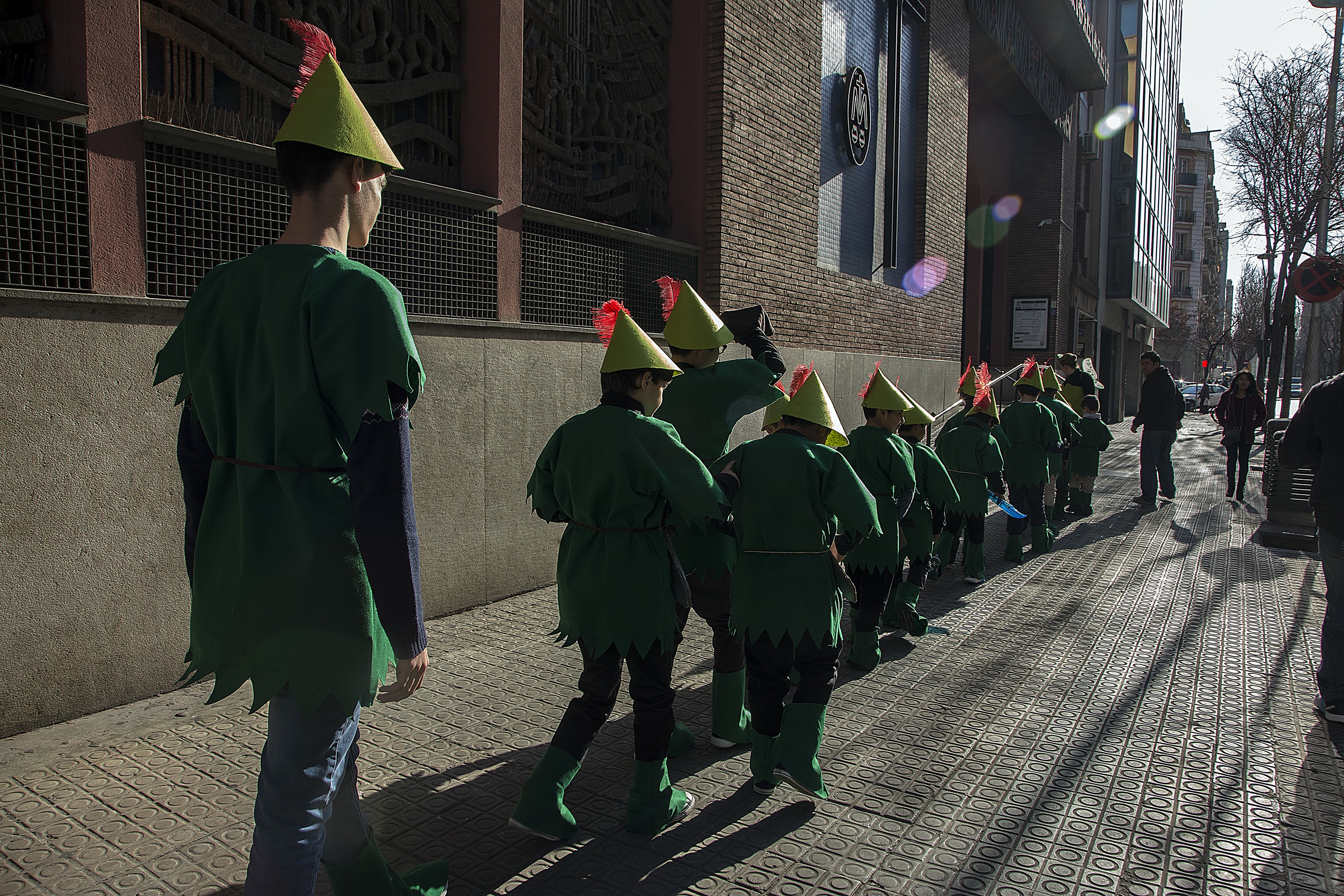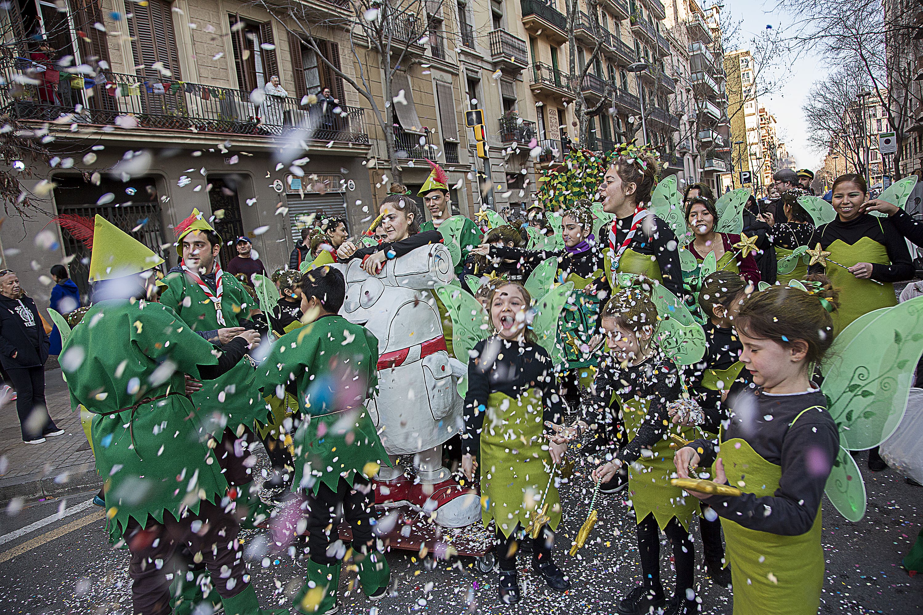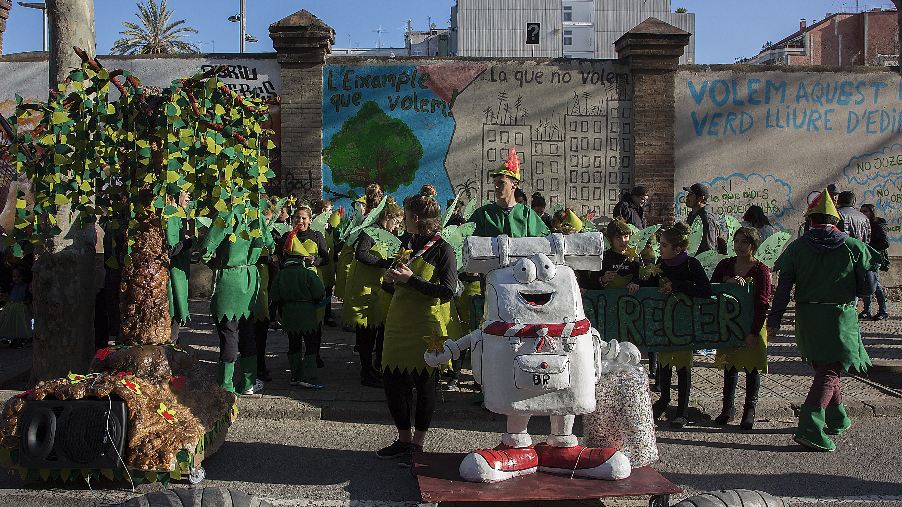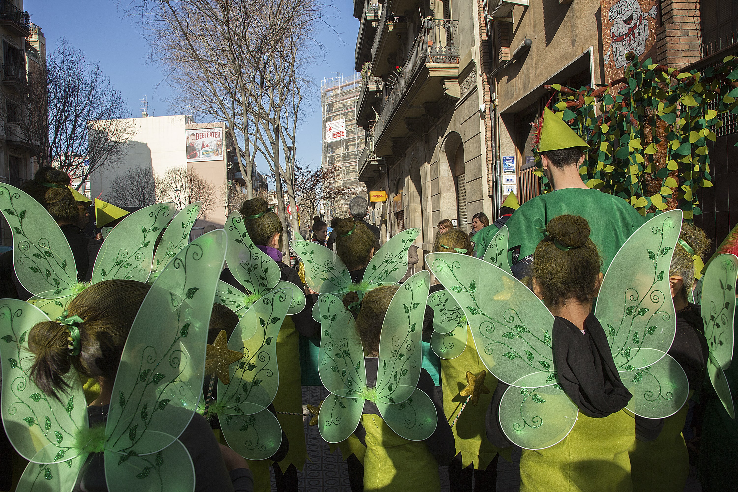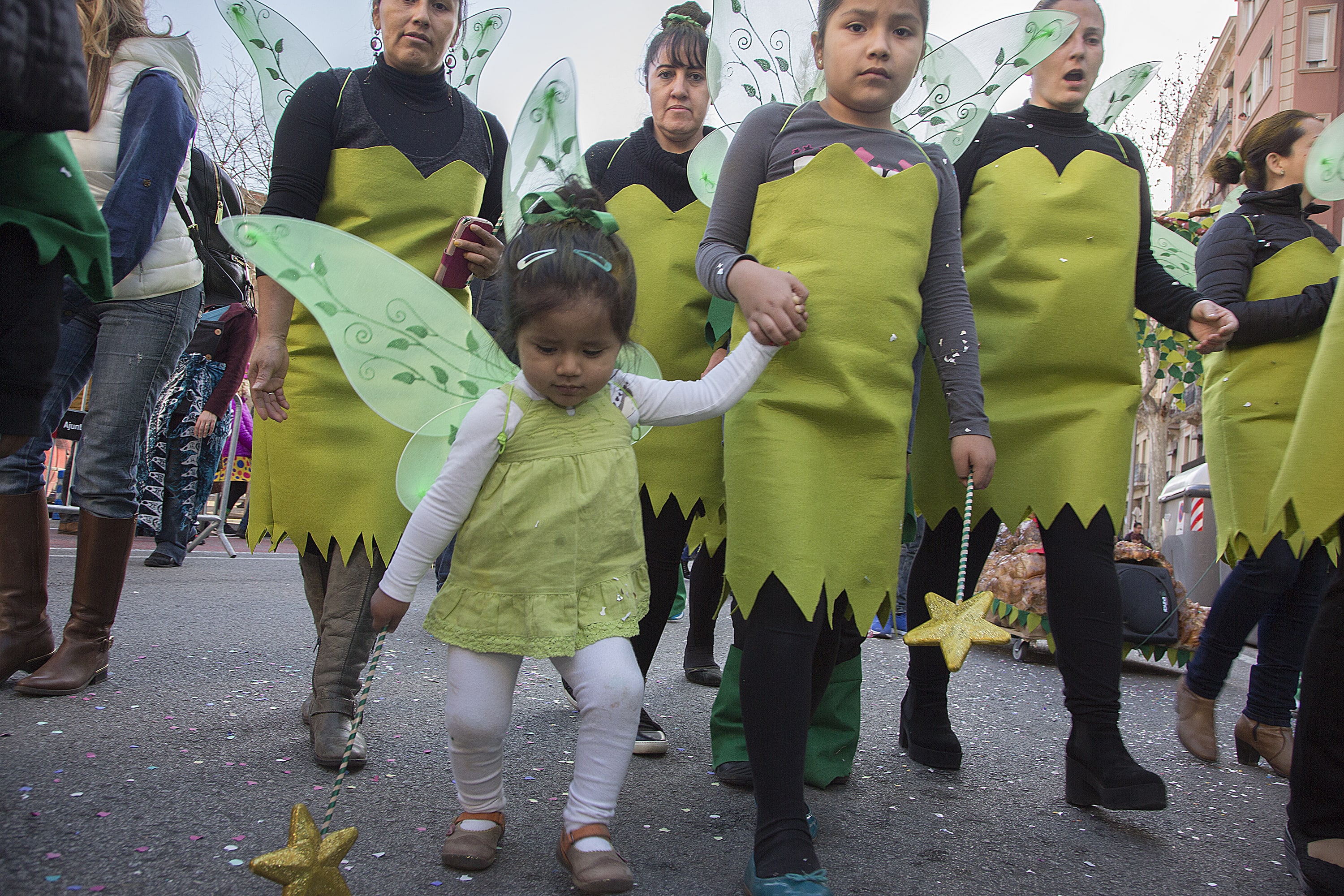 Dissabte, com a colofó d'una intensa setmana de preparatius, tocava sortir al carrer a desfilar per la rua del barri i lluir les nostres magnífiques disfresses. Les noies, transformades en Campanetes, anaven repartint pols màgica per tot arreu amb la seva vareta, mentre els nois, coberts amb el barret i la ploma de Peter Pan, brandaven incansablement les seves espases, preparant-se per la lluita contra el capità Garfi. En primera línia, el nostre estimat Mochilín obria la comparsa sota una pluja constant de confeti, i per darrere ens seguia un enorme arbre del país de "Nunca Jamas", on viuen en Peter Pan i la Campaneta.