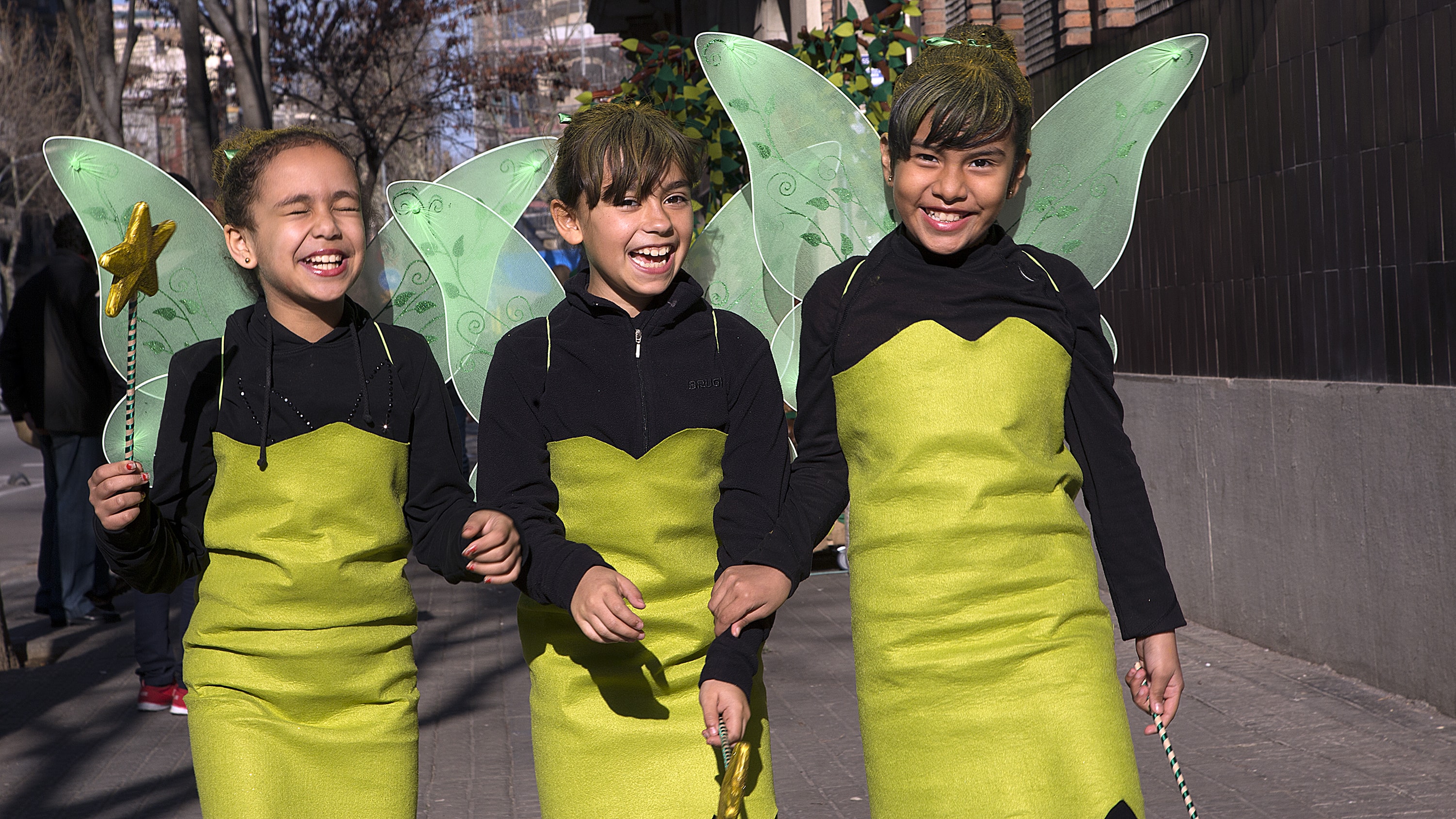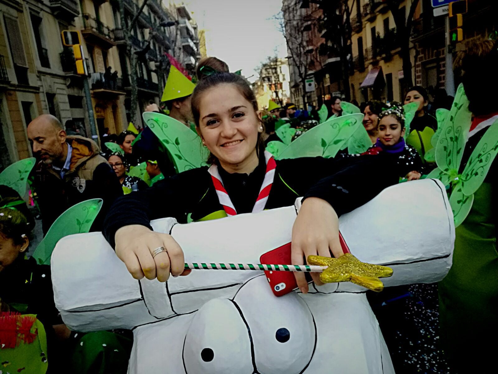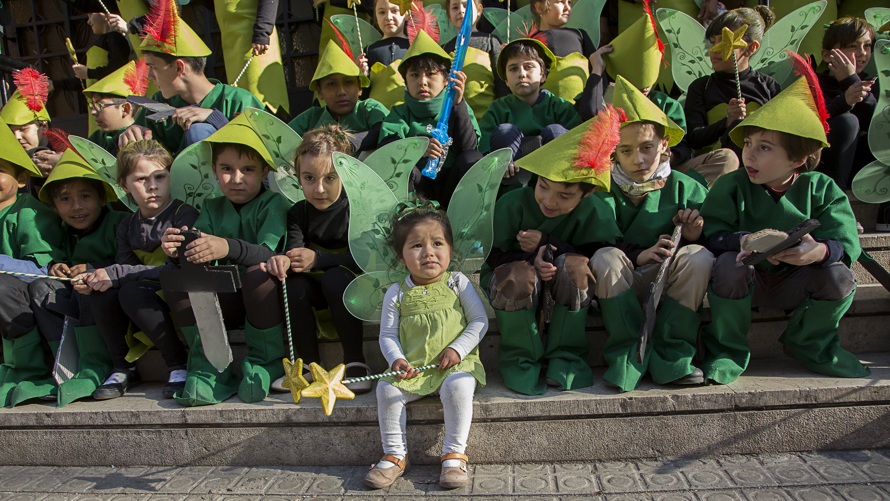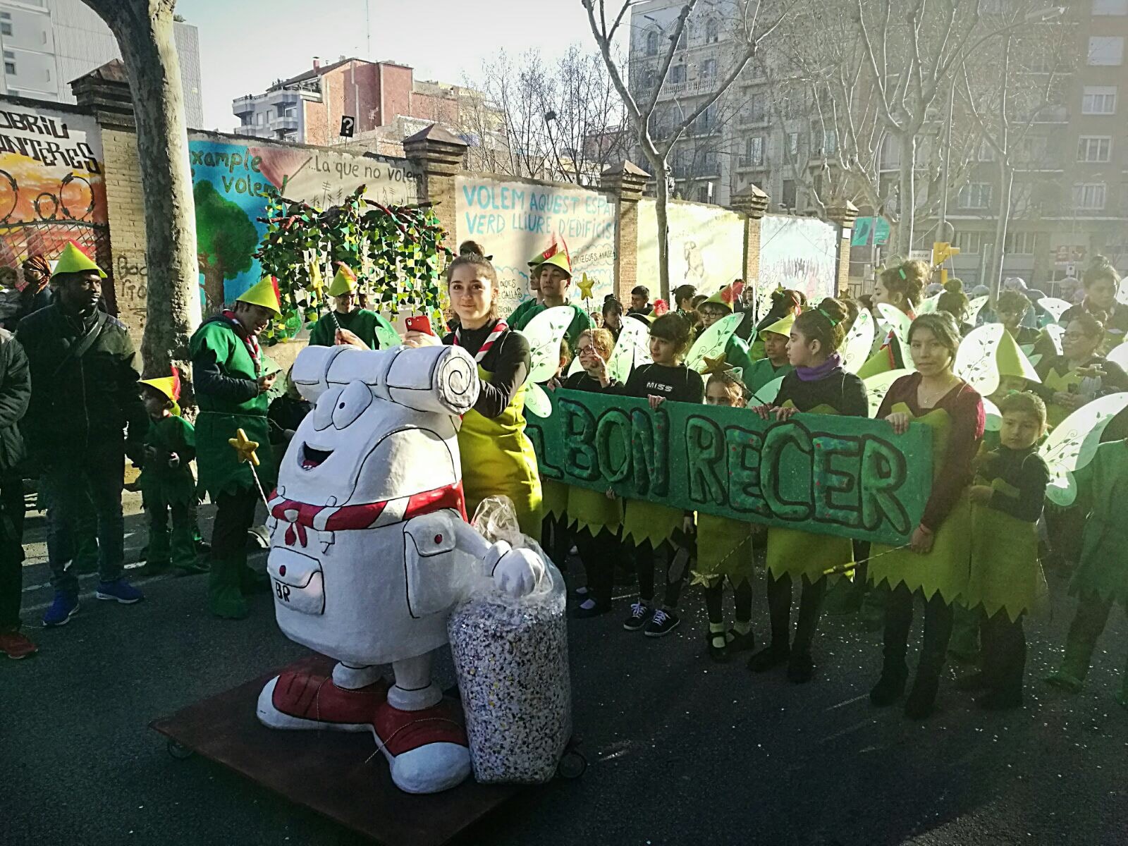 Dissabte, com a colofó d'una intensa setmana de preparatius, tocava sortir al carrer a desfilar per la rua del barri i lluir les nostres magnífiques disfresses. Les noies, transformades en Campanetes, anaven repartint pols màgica per tot arreu amb la seva vareta, mentre els nois, coberts amb el barret i la ploma de Peter Pan, brandaven incansablement les seves espases, preparant-se per la lluita contra el capità Garfi. En primera línia, el nostre estimat Mochilín obria la comparsa sota una pluja constant de confeti, i per darrere ens seguia un enorme arbre del país de "Nunca Jamas", on viuen en Peter Pan i la Campaneta.