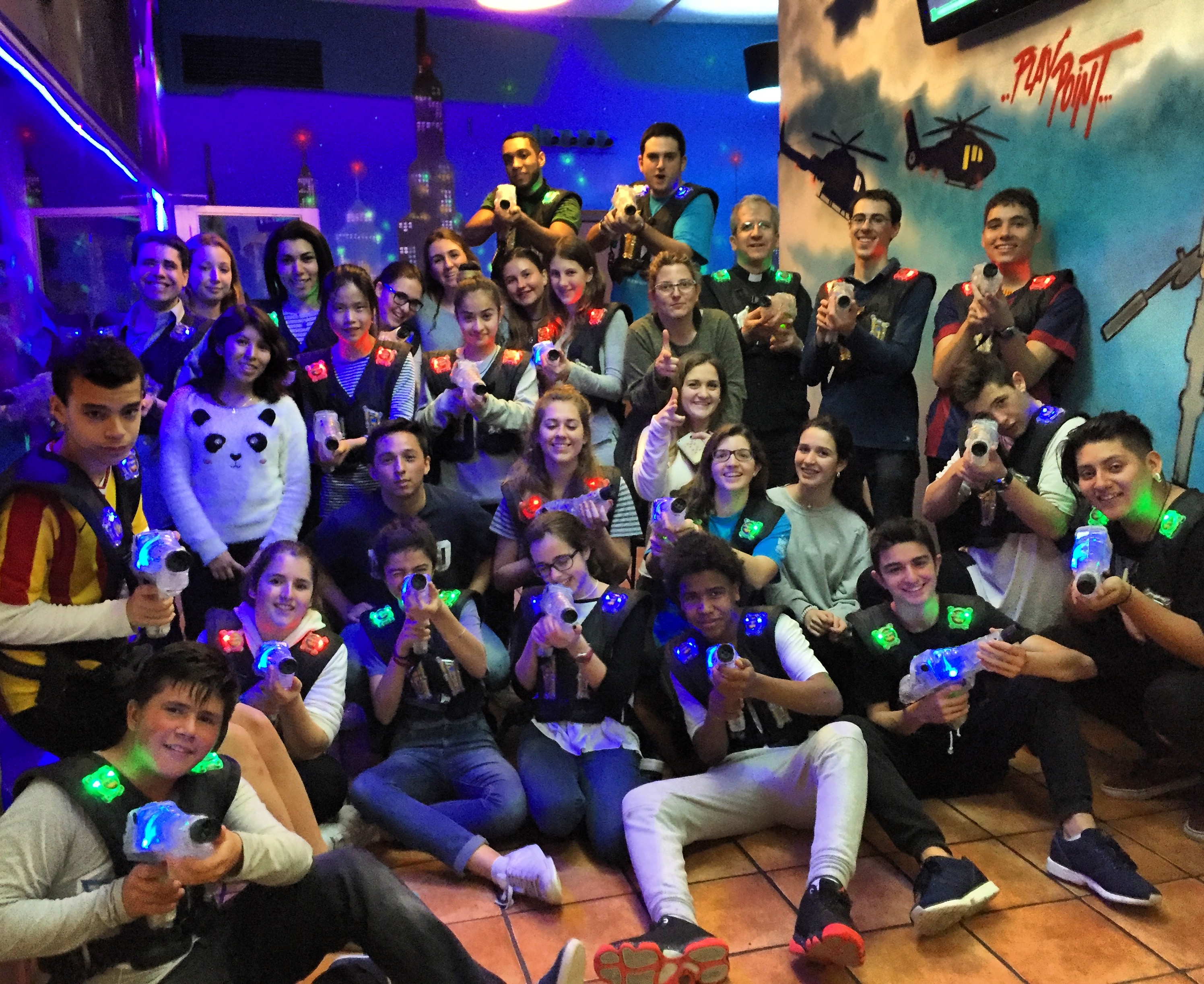 Este pasado viernes, como cierre del segundo trimestre del curso, los monitores y adolescentes del recreo nos reunimos para celebrar el cumpleaños de nuestro director Edu en un torneo de Play Point. La velada prometía y no era para menos. Tres equipos mixtos de monitores y adolescentes (verdes, rojos y azules) enfrentados en una batalla a tres partidas para conquistar la victoria. Aunque era el cumpleaños de nuestro director, nadie estaba dispuesto a dejarle ganar a las buenas, y así lo demostró desde el primer momento. Fuera, todo eran risas y compañerismo, pero en la sala de juego los tres equipos extenúa para llevarse el triunfo. Tanto fue así, que hasta la última partida el ganador aún estaba por decidir y la emoción se mantuvo intacta hasta los últimos instantes. Al sonido de la bocina que indicaba la finalización de la partida, todos corrieron ansiosos hacia el marcador para descubrir el ganador. La alegría cayó del lado del equipo verde, que consiguió imponerse de forma contundente sobre el resto. De todos modos, los tres equipos cabían en el podio y, por supuesto, el director, que a pesar de no pertenecer al grupo vencedor, era el protagonista de la noche.